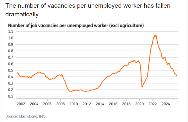 The ratio of job openings to unemployed workers has fallen below pre-Covid levels, with only four vacancies available for every ten workers seeking employment, according to Smith.
